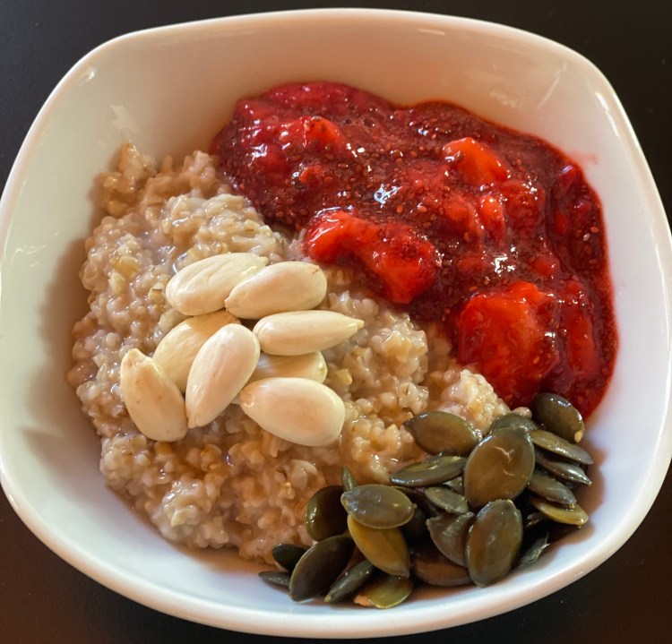 I usually start off my day with a bowl of porridge, topped with nuts, seeds and fruits. Before I go to bed, I prepare my breakfast for the next day. I soak oats, nuts and seeds overnight. Soaking helps the oat starches break down and increases the vitamin content of your nuts and seeds. Remember, all nuts and seeds contain phytic acid and large amount of enzyme inhibitors which protect them from sprouting. Soaking also makes them much easier to digest and absorbed by your body.