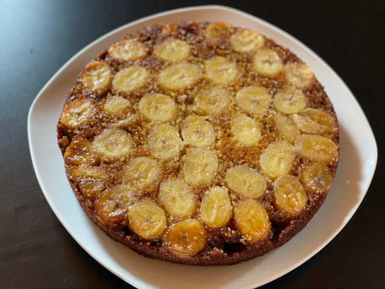 - Preheat oven to 180C. Grease the tin, arrange sliced banana decoratively and set aside.